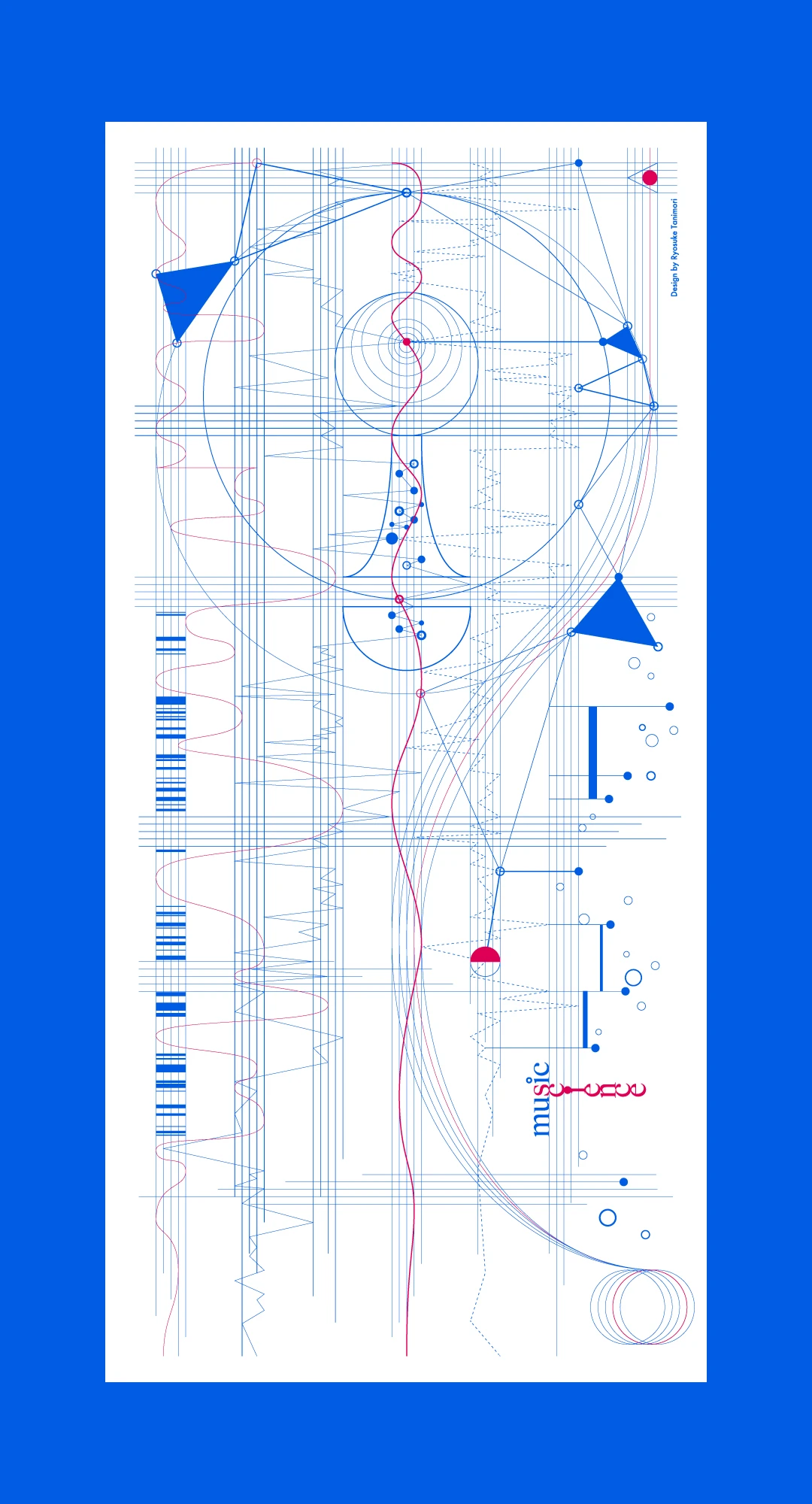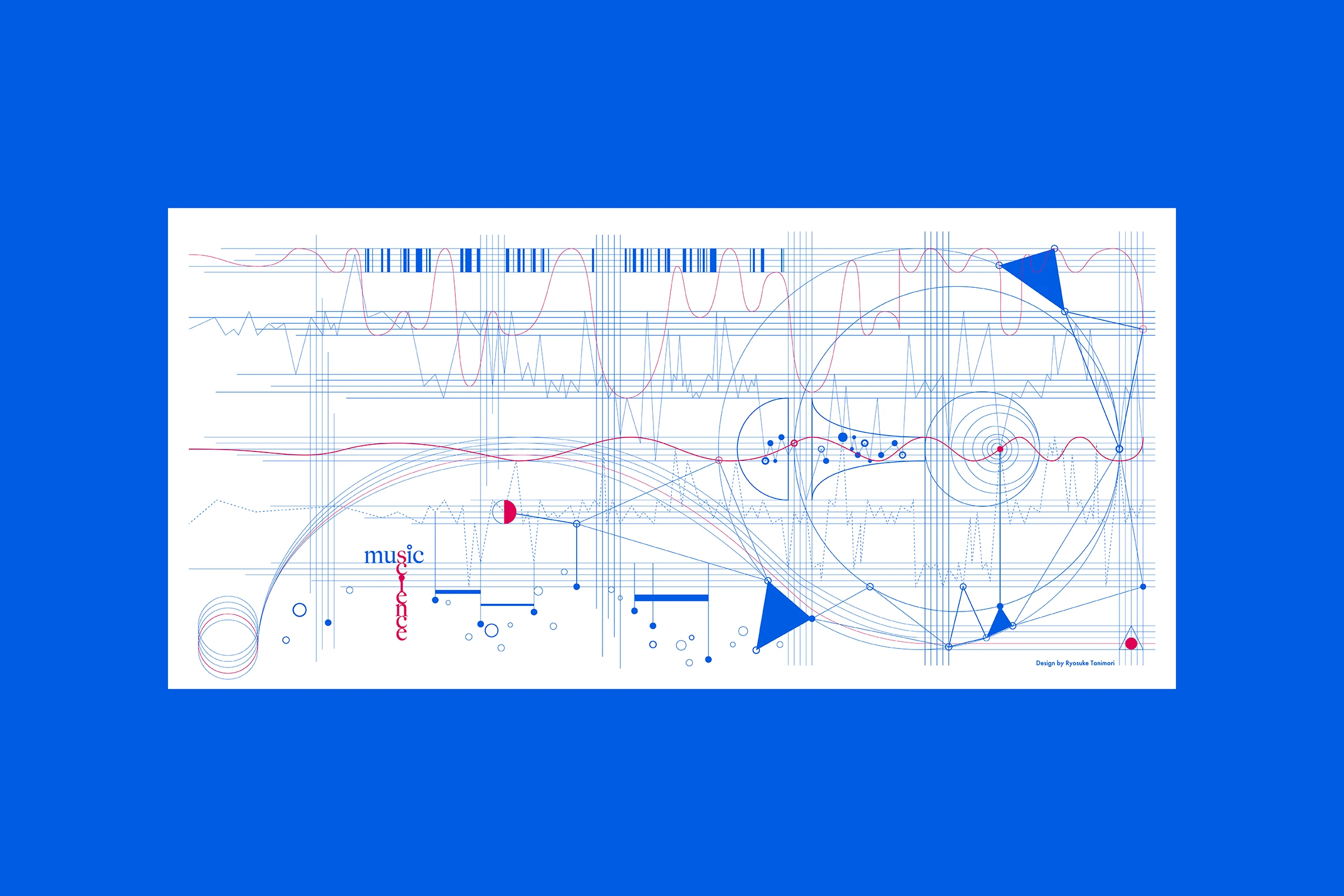 「音楽演奏科学」という新しい学問領域の確立を目指す研究者のウェブサイトキービジュアルのデザイン。五線譜や音符、休符、記号などの音楽を譜面化する際に使われる要素と、研究者自身が実験等で日常的に扱うツールやグラフ、波形など、それぞれの要素が互いに関係し合いながら融合し、まだ見たことのないカタチが生まれてくるイメージをグラフィカルに表現した。