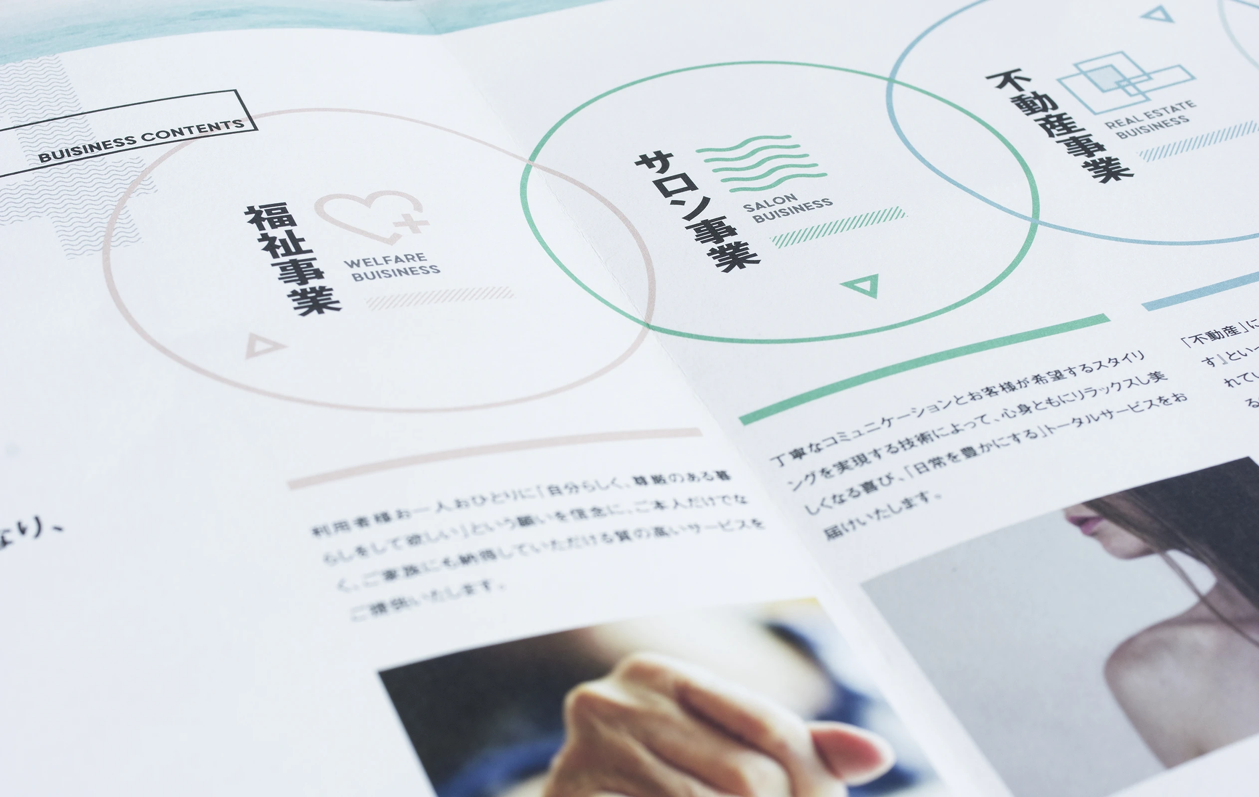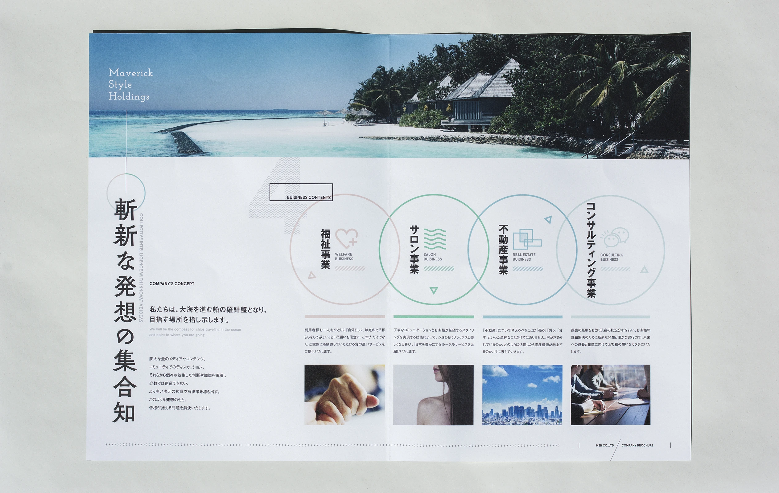 福祉、サービス、不動産、コンサルティングなど、複合的に事業展開をしている株式会社MSHの会社案内パンフレットのデザインを担当させていただきました。