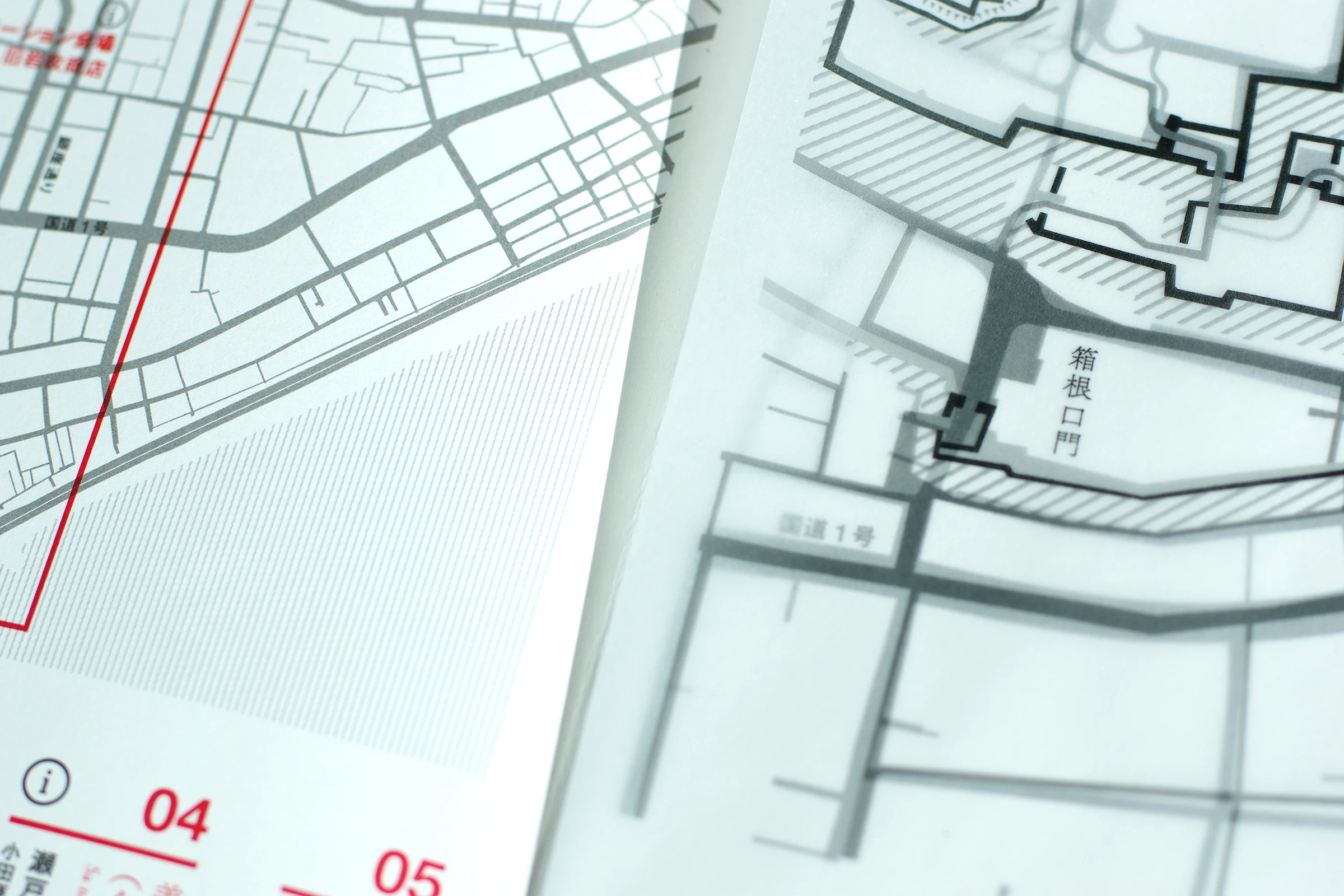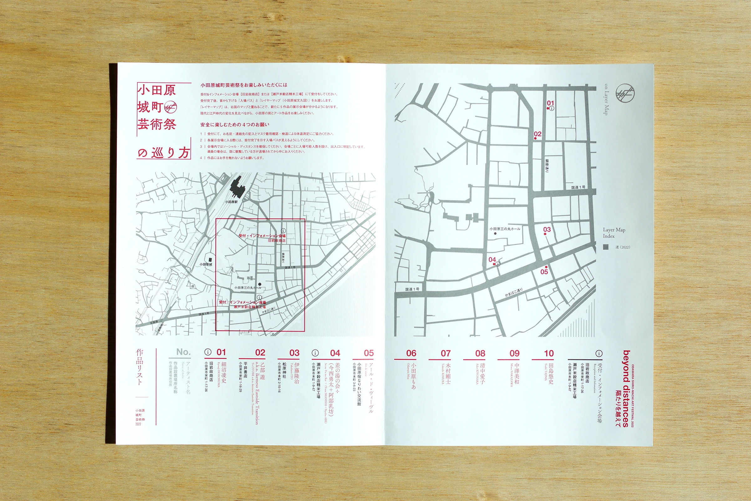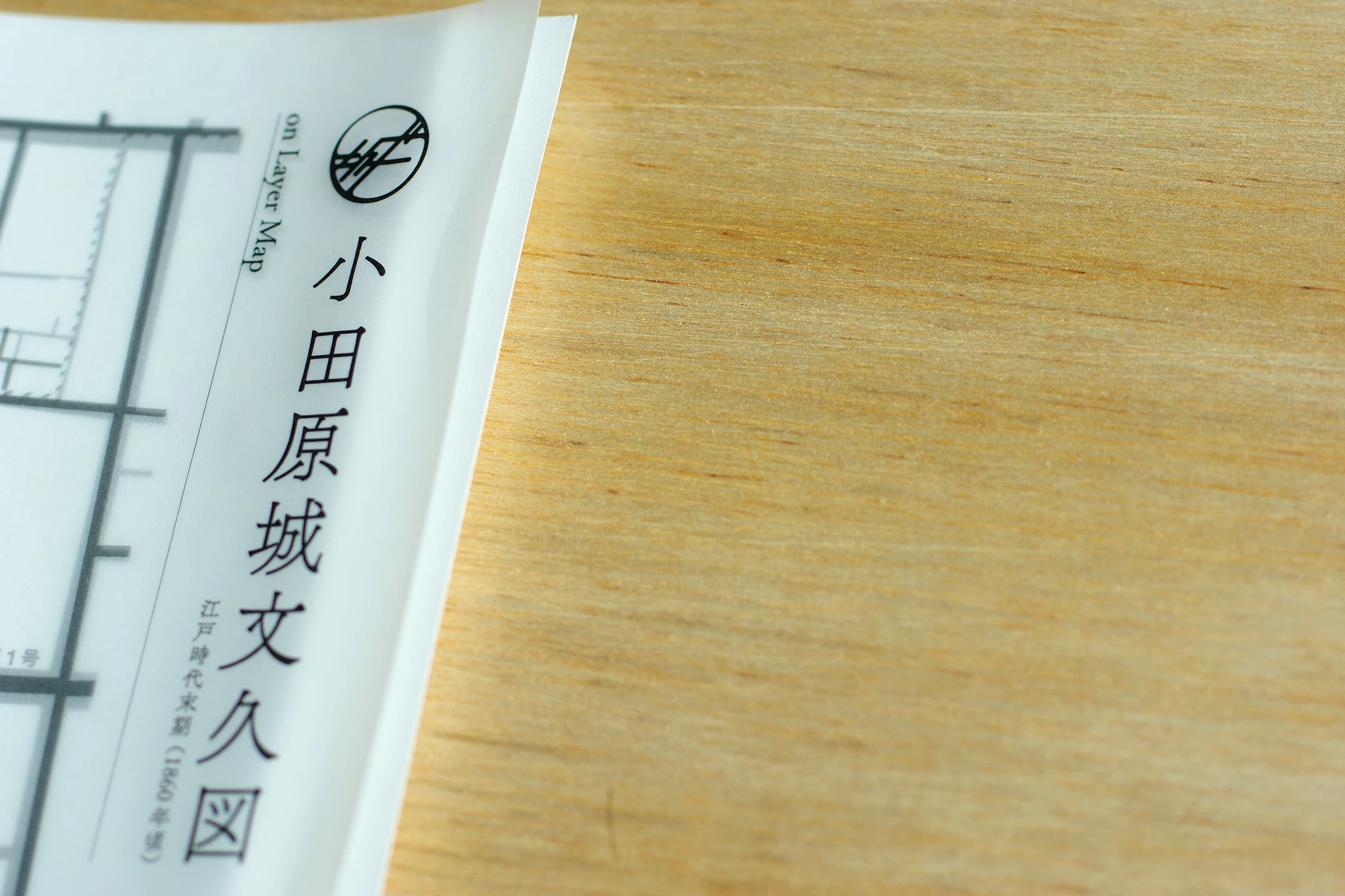 見開きフライヤーの中面には、現代の小田原の地図と展示会場情報の一部が載っていて、その地図にトレーシングペーパーに印刷された「レイヤーマップ」を重ねることで、すべての作品会場が浮かび上がる仕組みになっています。1860年頃(江戸末期)の「小田原城文久図」を元に制作したこのレイヤーマップを地図と重ねることで、今は車も通る道だけれど元々は濠だったとか、今はない道や水路、今もほとんど変わっていない道、城との位置関係など、宿場町として最も栄えていたとされる江戸時代の痕跡を感じながら、まち歩きを楽しむことができます。令和のレイヤーに江戸のレイヤーを重ねることで、普段何気なく歩いて見える風景が少し違ったものとなり、さらにその道中にある「小田原の歴史と現代をつなぐアート」が、私たちを想像する“時の旅”へと導いてくれます。